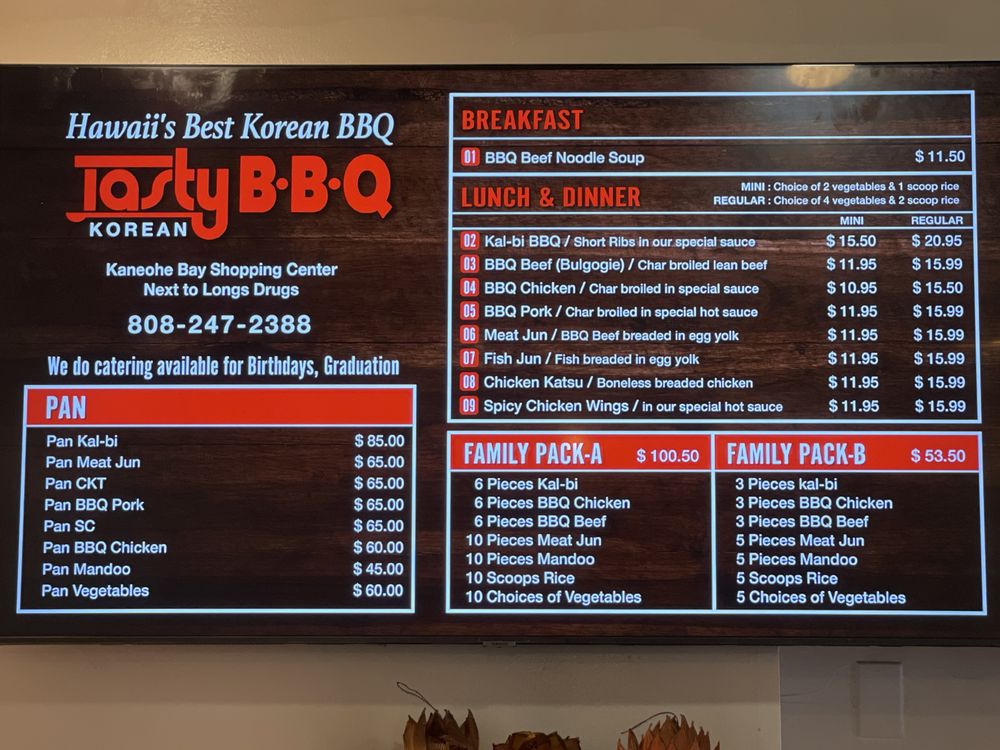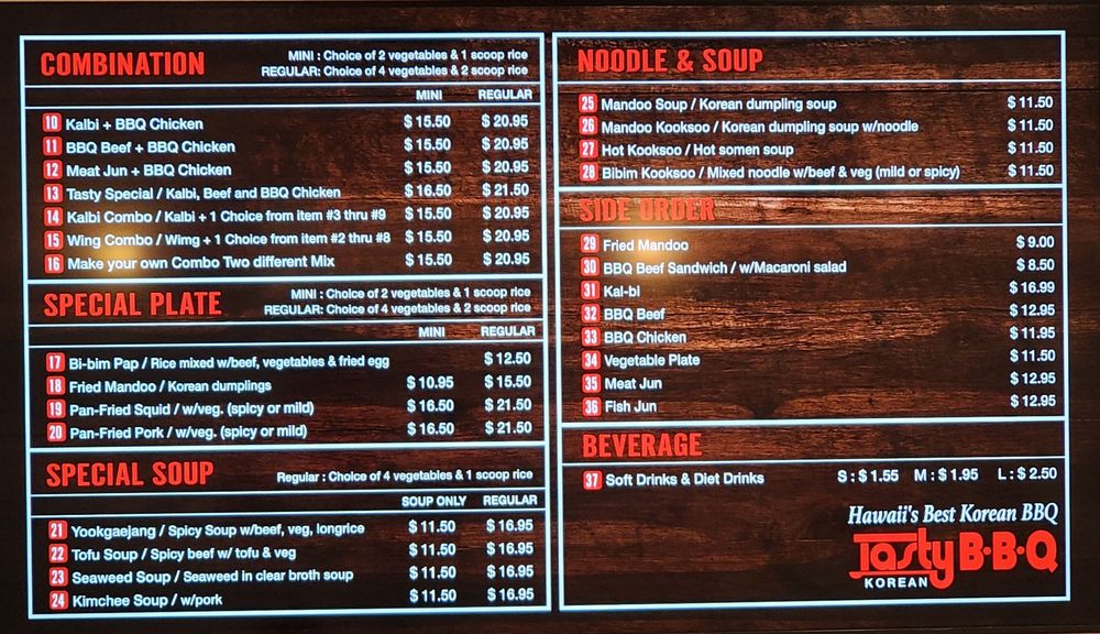 Introducing Tasty Korean BBQ 3, a Korean restaurant in Kaneohe offering a wide range of options for both lunch and dinner. With a welcoming vibe and friendly service, this spot is known for its huge portions, delicious meat jun, and flavorful kalbi. The menu includes specialties like Kim Chee Fried Rice and Tofu Spinach Salad, along with Curry dishes like Chicken Katsu Curry and Beef Curry. Customers rave about the generous vegetable options, the tasty BBQ chicken, and the fresh cucumber kimchi. The restaurant also offers catering services and is a great choice for groups or families looking for a satisfying meal. Overall, Tasty Korean BBQ 3 is a must-try for those craving authentic Korean flavors in a casual setting.
